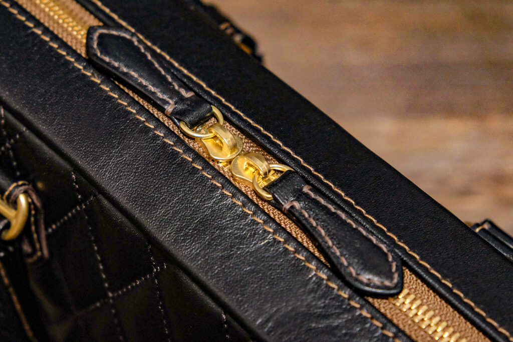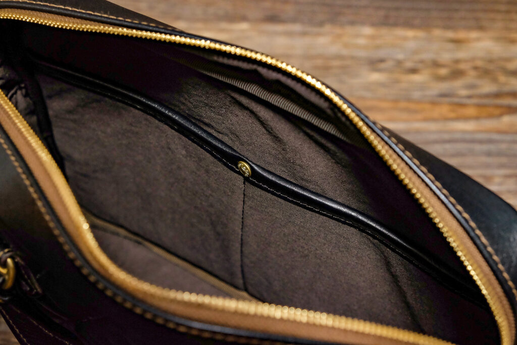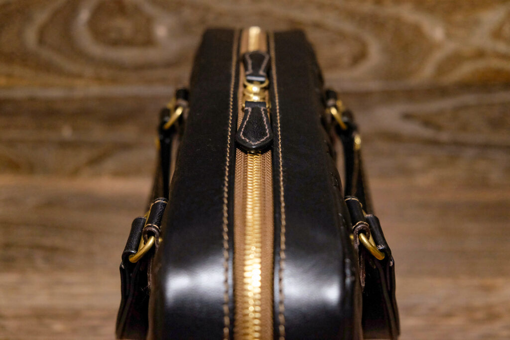 ゴールドのダブルジッパー。引き手は手縫い。茶褐色のテープカラーはオガワのお気に入りで、馬革JKTやウォレットにも同色を使う。マチ(奥行)は約70ミリで自立もする。