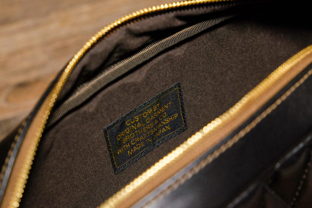 バッグ内部には「Original Garment Brothers」のオリジナルラベルを縫い付けている。黒地に金文字の組み合わせは、フライトJKT「A-2」のラベルがモチーフ。