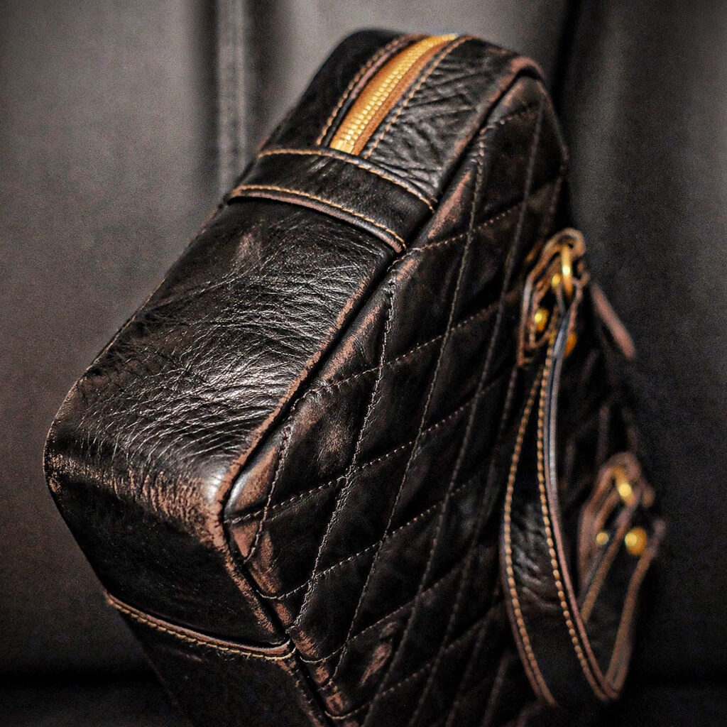 上の写真は以前、耐久性を確認するテストとして強制エイジングさせた個体だ。屋外での使用時、意図的に壁面や電柱に擦り付け、アスファルトの地面に接触させたりもした。雨天時には濡れることも厭わず、型崩れするほど揉み込むことも多々。馬革やステッチやパーツなど、ダメージを受けやすい箇所を探るためのハードなテストを行った。