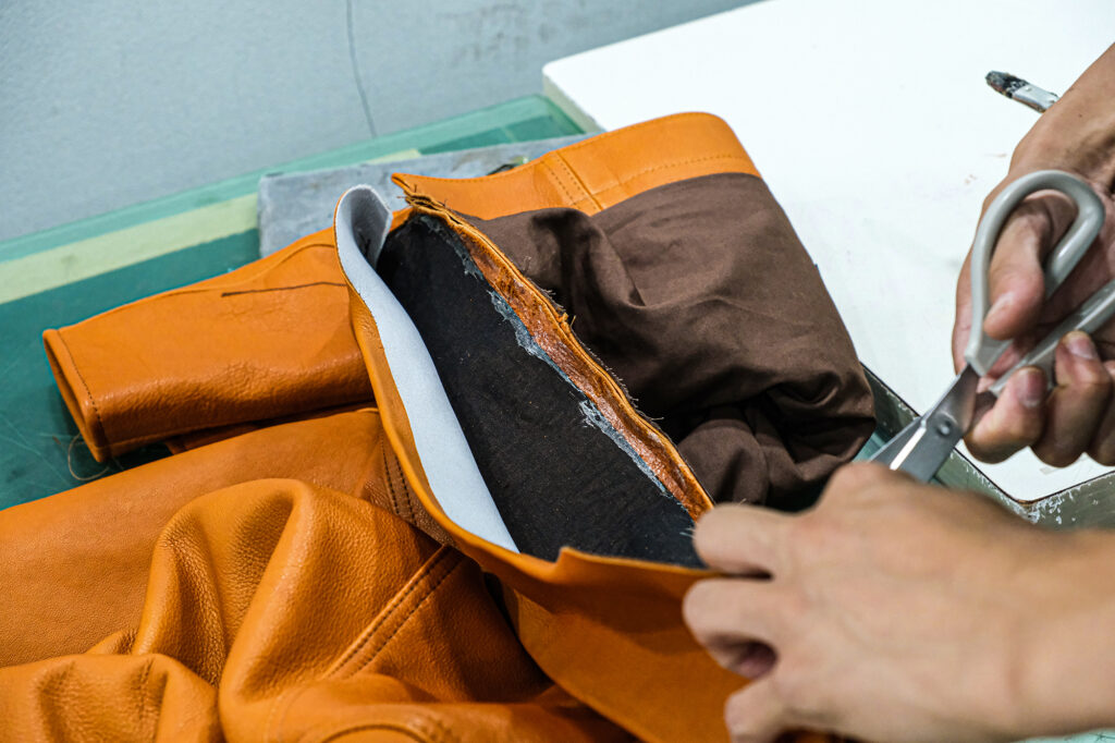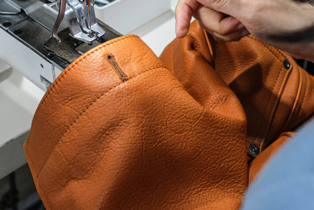 鹿革同様、非常に柔軟なステアオイルのジャケットには、型崩れや伸びを低減するため硬さの異なる芯材を適材適所で使い分ける。その作業に費やされる手間や時間は、馬革JKTの遥か上を行く。見えない部分ではあるが、着用時のシルエット、ジャケットの耐久性に大きな影響を及ぼす、もっとも重要な作業と言える。