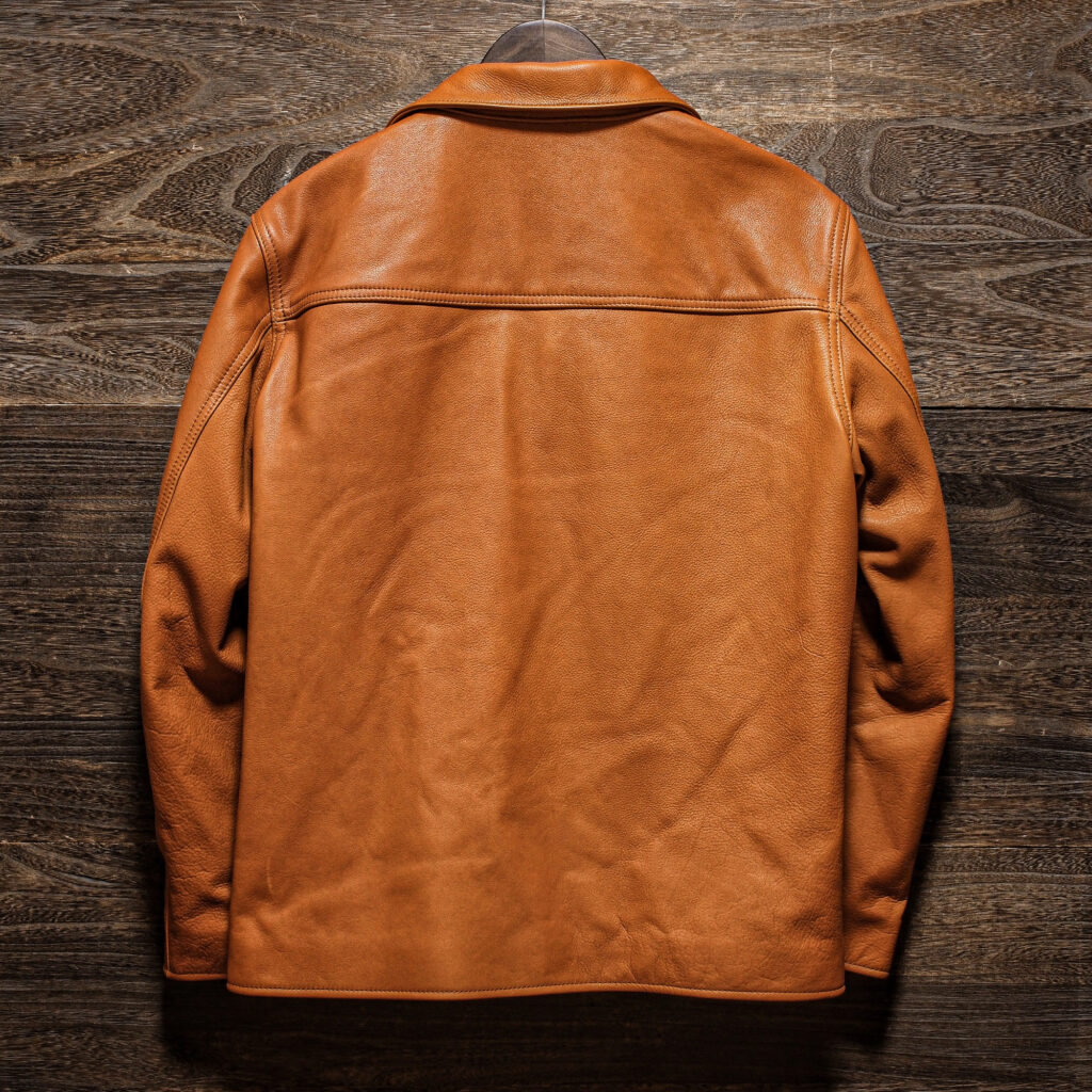 ワークシャツをモチーフとしたデザインだが、他のレザーJKTと同様、アウターとして着用して頂きたい。一直線のヨークを備えたシンプルな後ろ姿。アクションプリーツは設けていないが、柔軟な革質ゆえ、新品時からストレスフリーな着心地を約束する。