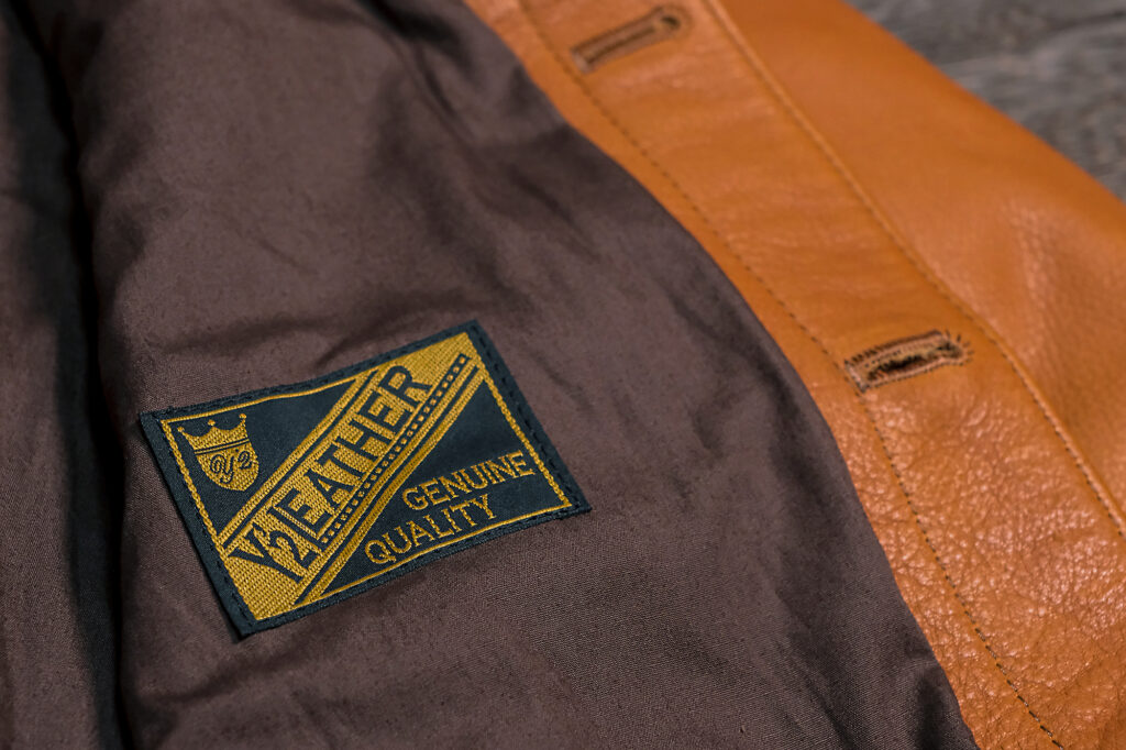 襟元のオリジナルラベル、ブラウンのコットンライニングは、他のレザーJKTと同じ仕様。