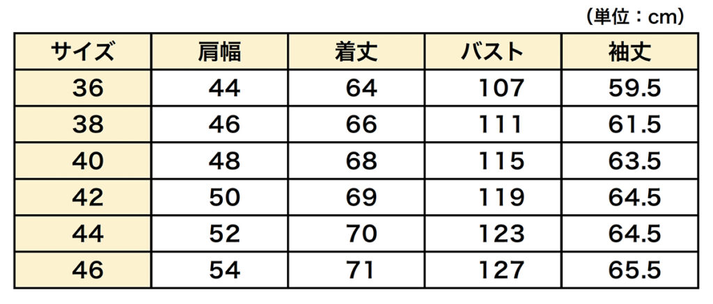 ※おおよその身幅(左右の脇下の直線距離)は、上記バスト寸法から2センチを引いて、半分に割った数値となります。