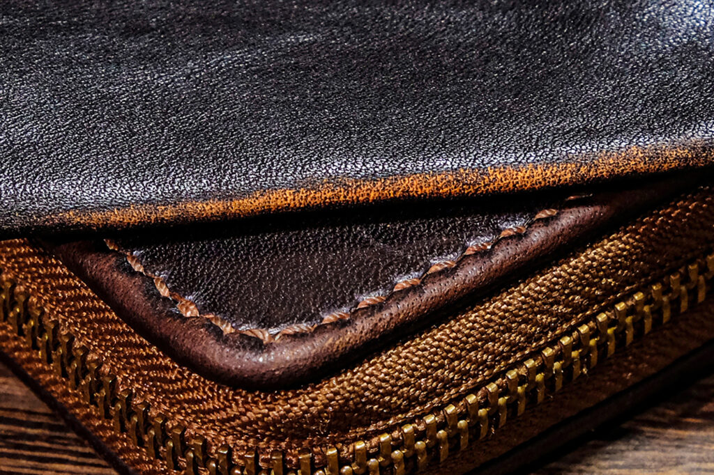 下地をややオレンジを帯びた明るめの茶色で染めることで、コントラストが効いた見事なエイジングを楽しむことができる。上写真は従来の馬革で仕立てたウォレットと比較した、茶下地の色の違いだ。