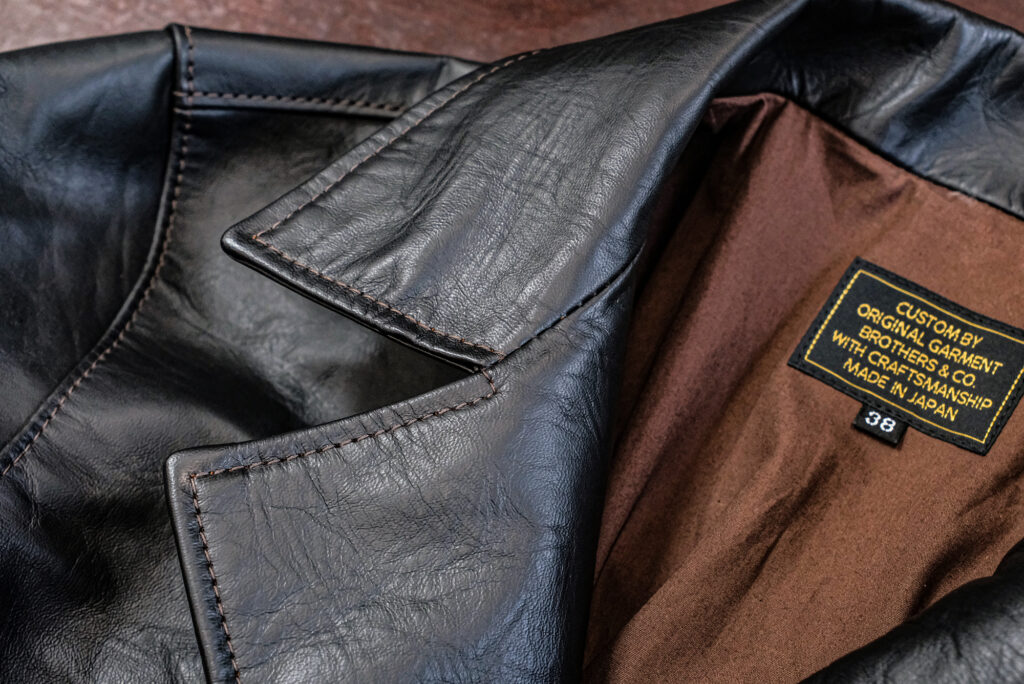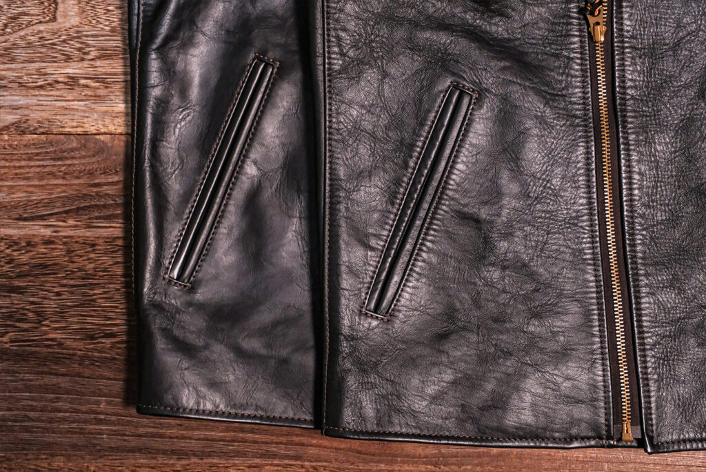さらに「襟」と「前立て」に馬革のシボを積極的に使うことにした。前立ては折り返した時のフロント側にシボを優先的に使う。言葉では少々わかりづらいと思うが、つまり前立ての裏面にシボを優先的に使うことになる。