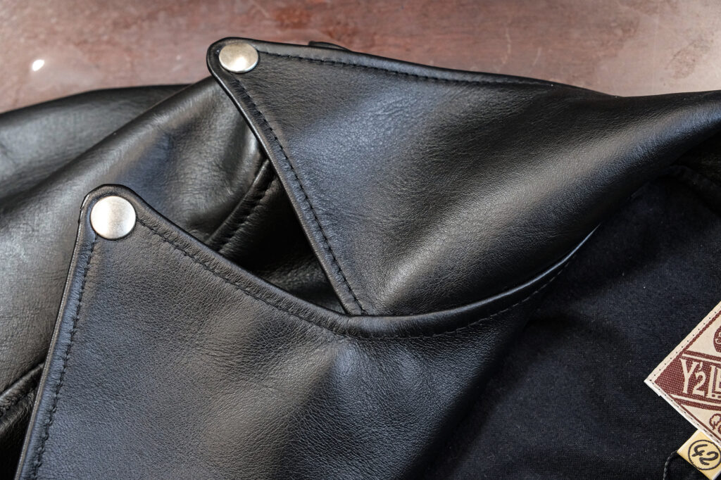 この2枚の写真の違いがわかるだろうか。上は「OG-29」、下はワイツーレザーのダブルライダース。実は襟の取り付け方が異なる。