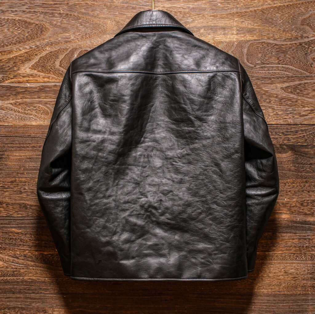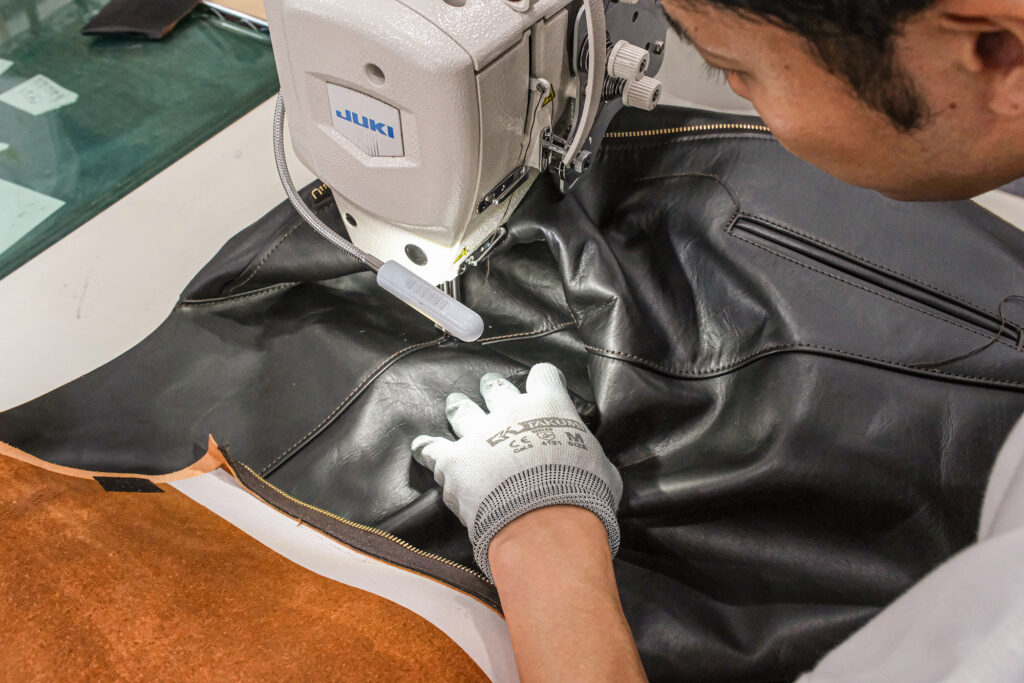 革厚は1.3ミリ。タンナーで仕上がった馬革を漉き屋に送り、1.3ミリ均一に割る。若い頃はぶ厚い馬革JKTも気合いで着こなせたが、オヤジになると気合いよりもストレスが勝る。だが、薄っぺらい馬革ではオヤジの嗜好品としての役目は果たさない。様々な厚みを検証し、オガワが導き題した「馬革の黄金厚」が1.3ミリなのである。