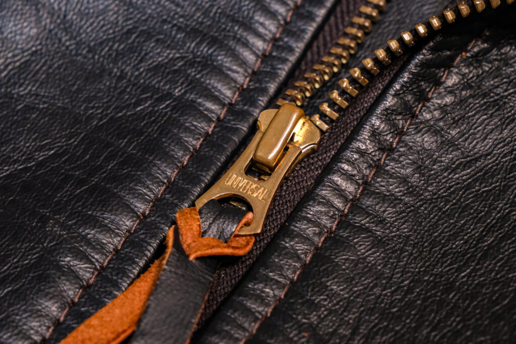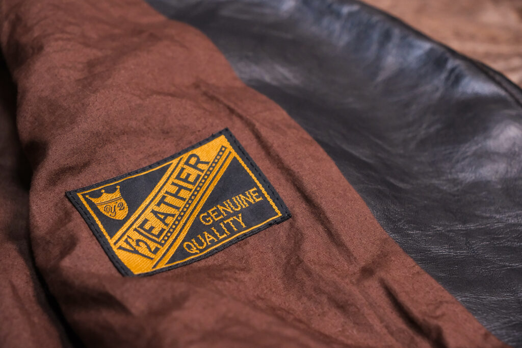 フライトJKT「A-2」をモチーフにした襟ラベル。ゴールドのユニバーサルジッパー。身頃&袖にはダークブラウンのコットンライニング。汗でペタペタするナイロンライニングは好みではない。