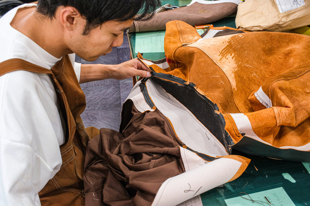 2025年5月、生産ファクトリーであるワイツーレザーにて、ダブル製作の打ち合わせを行った。数々のリクエストを職人たちに伝えたが、もっとも強く訴えたのが「大き過ぎない襟」「シボを使った襟」そして「テーラードのような襟」である。