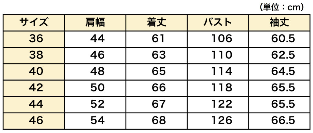 ※おおよその身幅(左右の脇下の直線距離)は、上記バスト寸法から2センチを引いて、半分に割った数値となります。