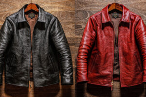 この2枚の写真の違いがわかるだろうか。上は「OG-29」、下はワイツーレザーのダブルライダース。実は襟の取り付け方が異なる。