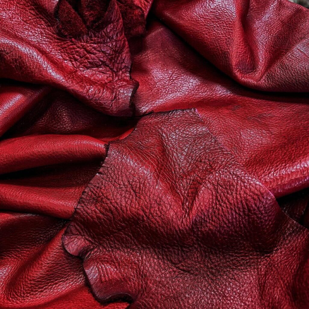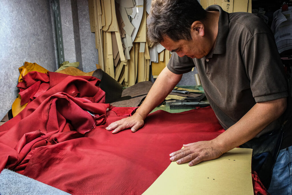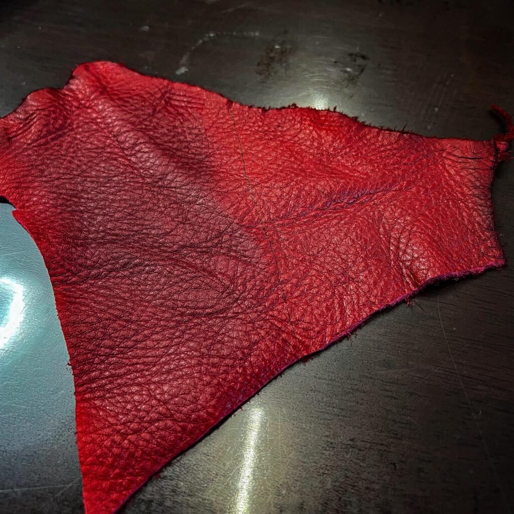 2025年5月、生産ファクトリーであるワイツーレザーを訪れた際、オガワが脳内でイメージする「赤鹿」の色味を再現し、色見本として藤岡勇吉本店の染色職人に渡すことにした。だが、赤い鹿革は手元にない。そこで馬革である「赤馬」のシボの部位を切り取り、オイルを擦り込んで深みを加え、色見本を作った。それが上写真である。